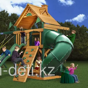 Комплектация площадки: Большой Игровой Форт с деревянной крышей, которая оснащена мансардным окошком и трубой. Качели на металлических цепях, качели/трапеция с ручками Спиралеобразный спуск - труба! Горка с двойной волной, длина 3, 0 метра! Столик для пикника со скамейкой! Скалодром с канатом для поддержки! Канатная сетка для лазанья Телескоп, Штурвал, Панель "Тик-Так" Песочница под фортом.