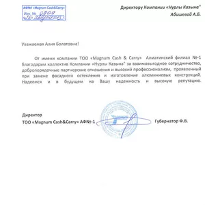 Компания Нурлы Казына предлагает своим клиентам следующие виды работ: Продажа и установка металлопластиковых и алюминиевых окон и дверей от мировых производителей; Осуществление замены стеклопакетов любых типов в дверях и окнах Диагностика металлопластиковых и алюминиевых конструкций; Замена и изготовление москитных сеток и оконной фурнитуры; Замена подоконника и отлива; Очищение и смазывание основных механизмов конструкций; Продажа и замена жалюзи; Ремонт окон, произведенных и установленных другими компаниями; Установка противовзломной фурнитуры.